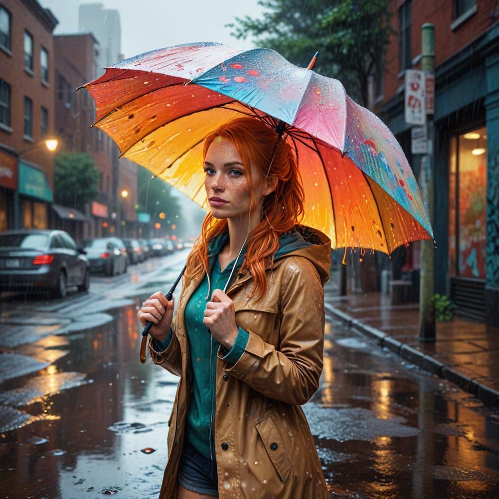 This image captures a moment of rain-soaked street art, with a strawberry blonde woman walking outside, umbrella in hand, amidst a backdrop of colorful graffiti and splashing puddles, created in a highly detailed and polychromatic style.