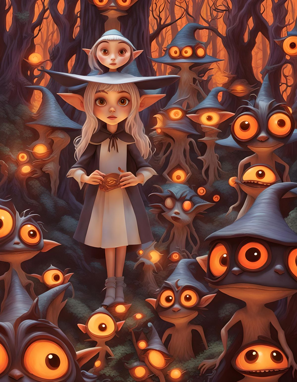 A 3D hyperrealistic image of an adorable elven witch in a magical forest. This stunning fantasy art piece features vibrant colors, intricate details, and a surreal, extra-dimensional design.
