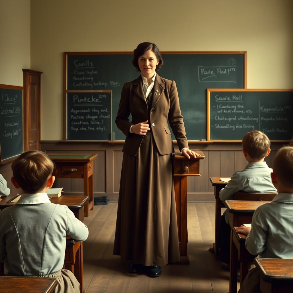 This image shows a schoolteacher in a blazer and long skirt standing at a wooden desk in a 1910 English classroom. The classroom includes vintage blackboards and students rendered with muted, earthy tones.