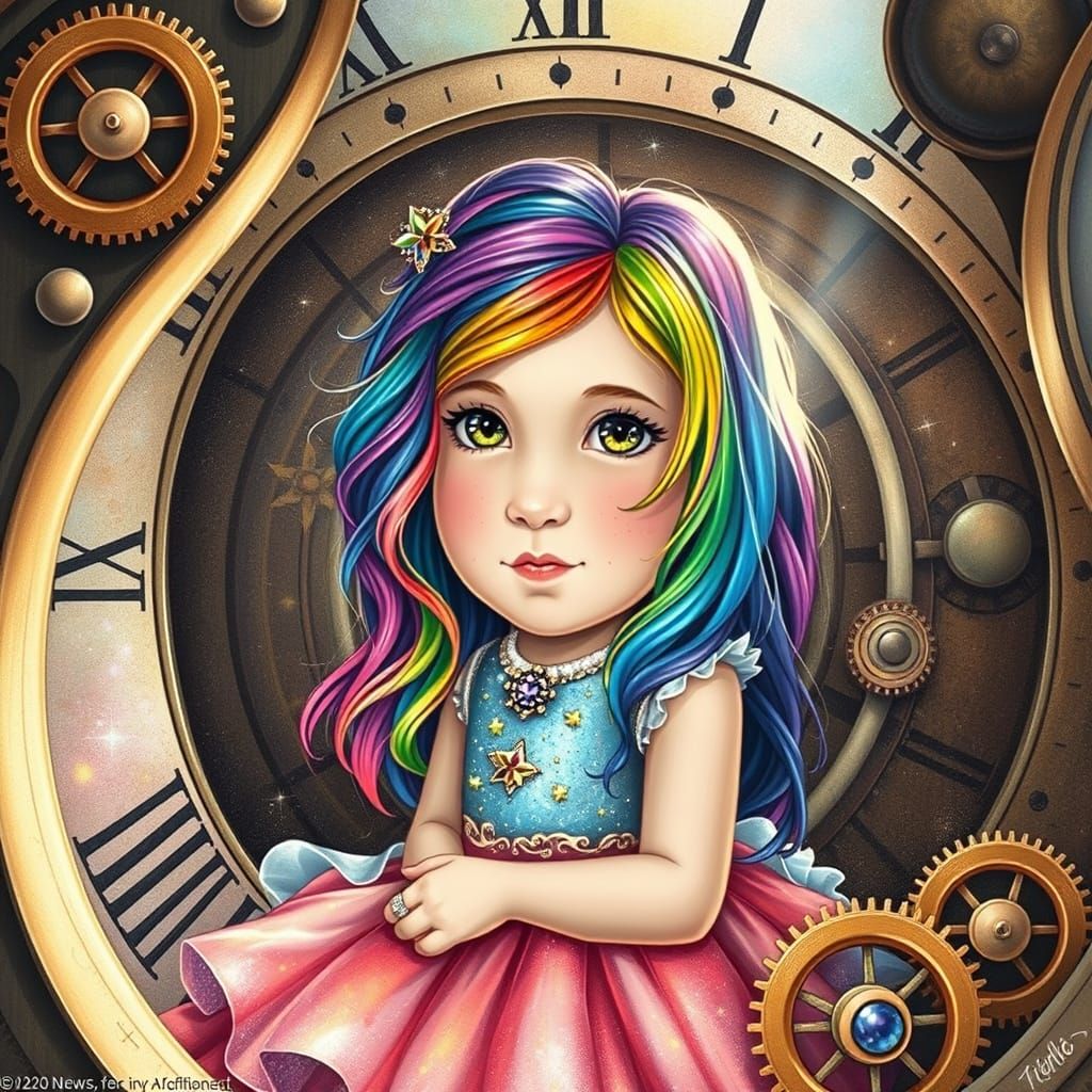 A vibrant image of a girl with rainbow hair and gemstone eyes inside a clock tower. Soft sunlight illuminates the scene in a whimsical, glossy, colored pencil art style.