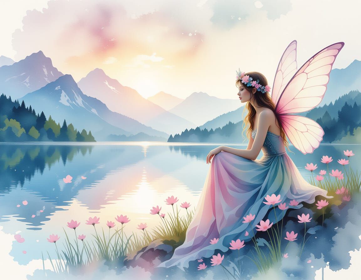A watercolor image showing a fairy in a dreamy landscape. The style features a soft, colorful pastel palette with intricate details, reminiscent of a double exposure.