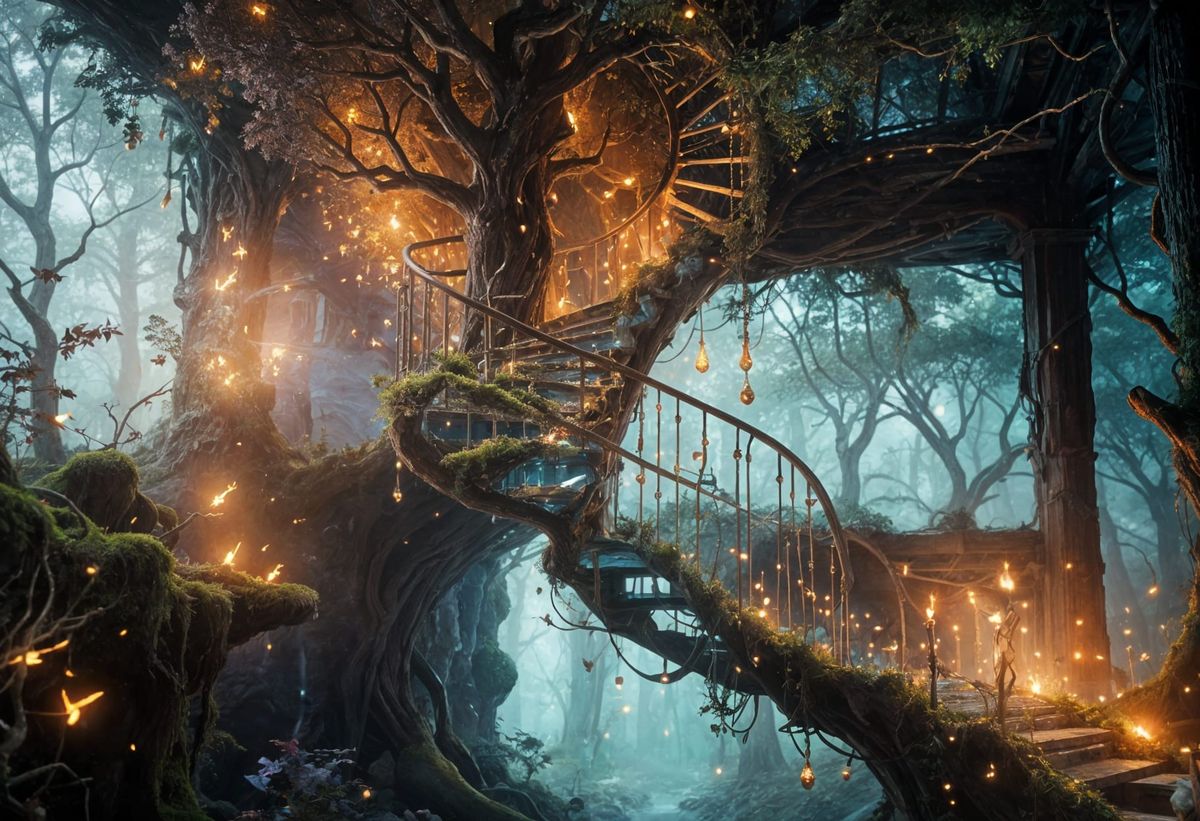 An intricate, glowing spiral staircase made of iridescent white pearl, winding upward through a mystical bioluminescent forest. The staircase is surrounded by towering ancient trees with bark that mimics a slatted wooden texture, glowing with golden embers between the grooves. Vivid colors of neon violet, ...