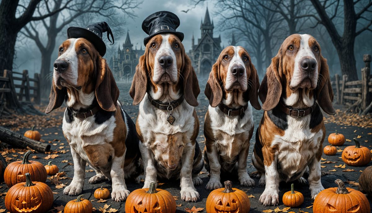 This detailed matte painting captures Basset Hounds looking at the camera, rendered in a fantastical, deep color palette with intricate details.
