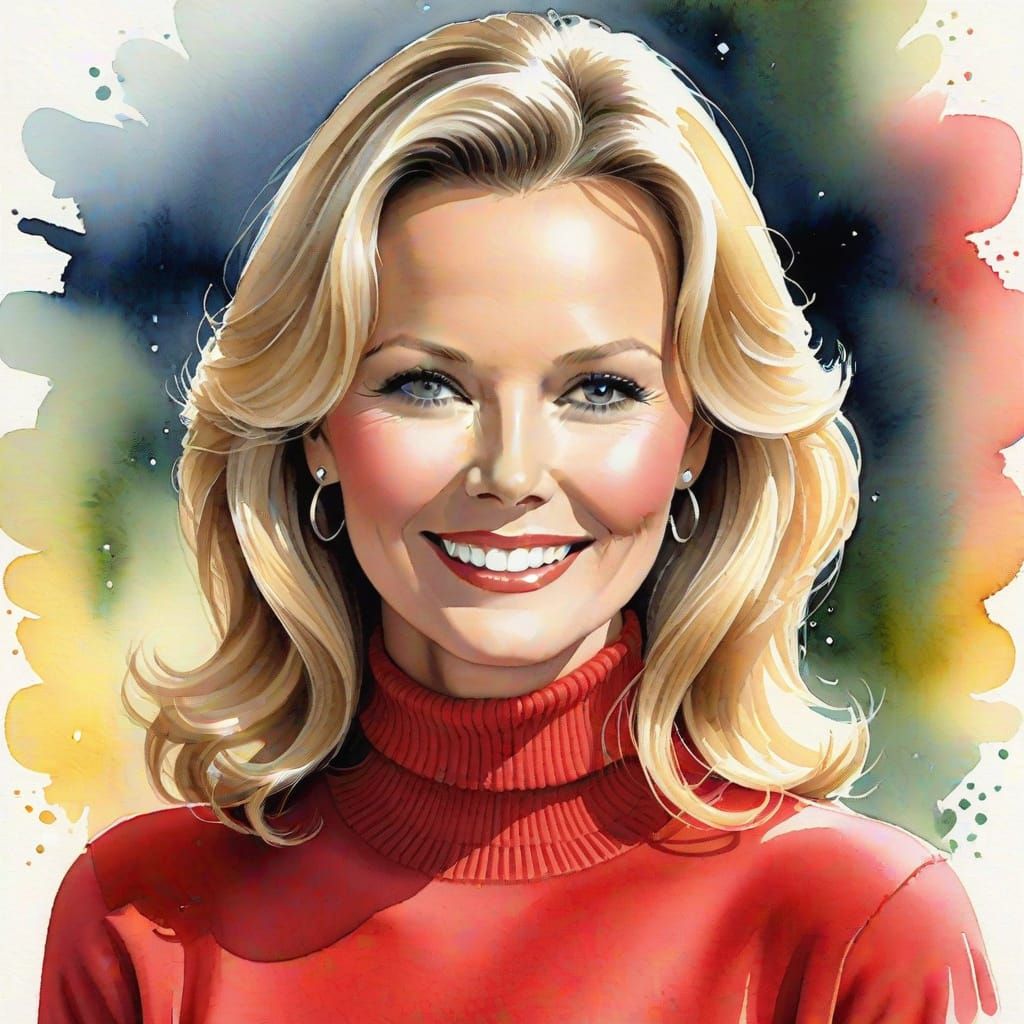 A watercolor portrait of Cheryl Ladd with a shy smile, wearing a red sweater. The artwork evokes a storybook illustration aesthetic with soft, realistic features.