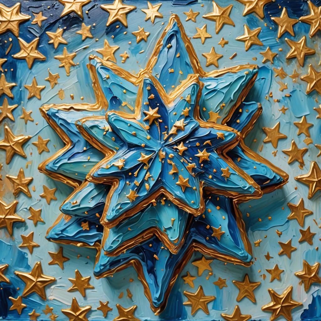 A vibrant oil painting of a blue star-shaped cake adorned with gold decorations. This striking image showcases the cake in a neo-impressionistic expressionist style with textured paint.