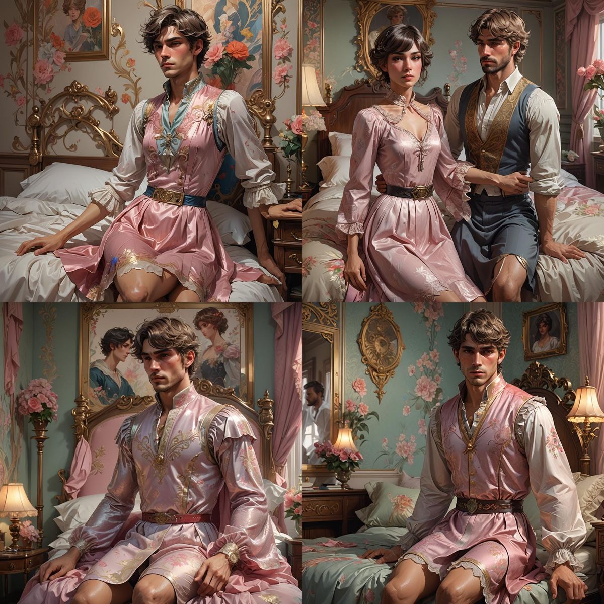 This detailed portrait captures a muscular boy with short hair and hairy legs, depicted in a girlish dress within a feminine bedroom. Rendered in a dynamic, hyperdetailed concept art style with volumetric lighting.