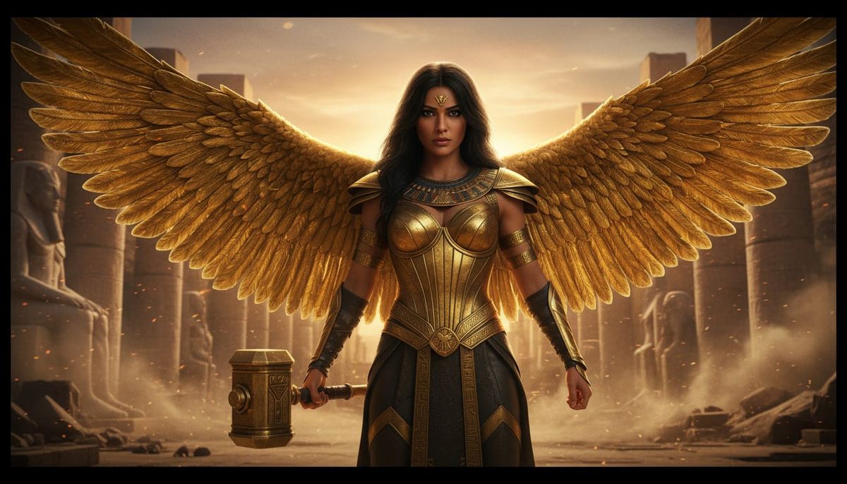This image depicts a powerful Egyptian female warrior in ornate golden armor, featuring striking golden wings and wielding a war hammer. Presented as a cinematic film still with a dramatic, high-resolution 3D game aesthetic.