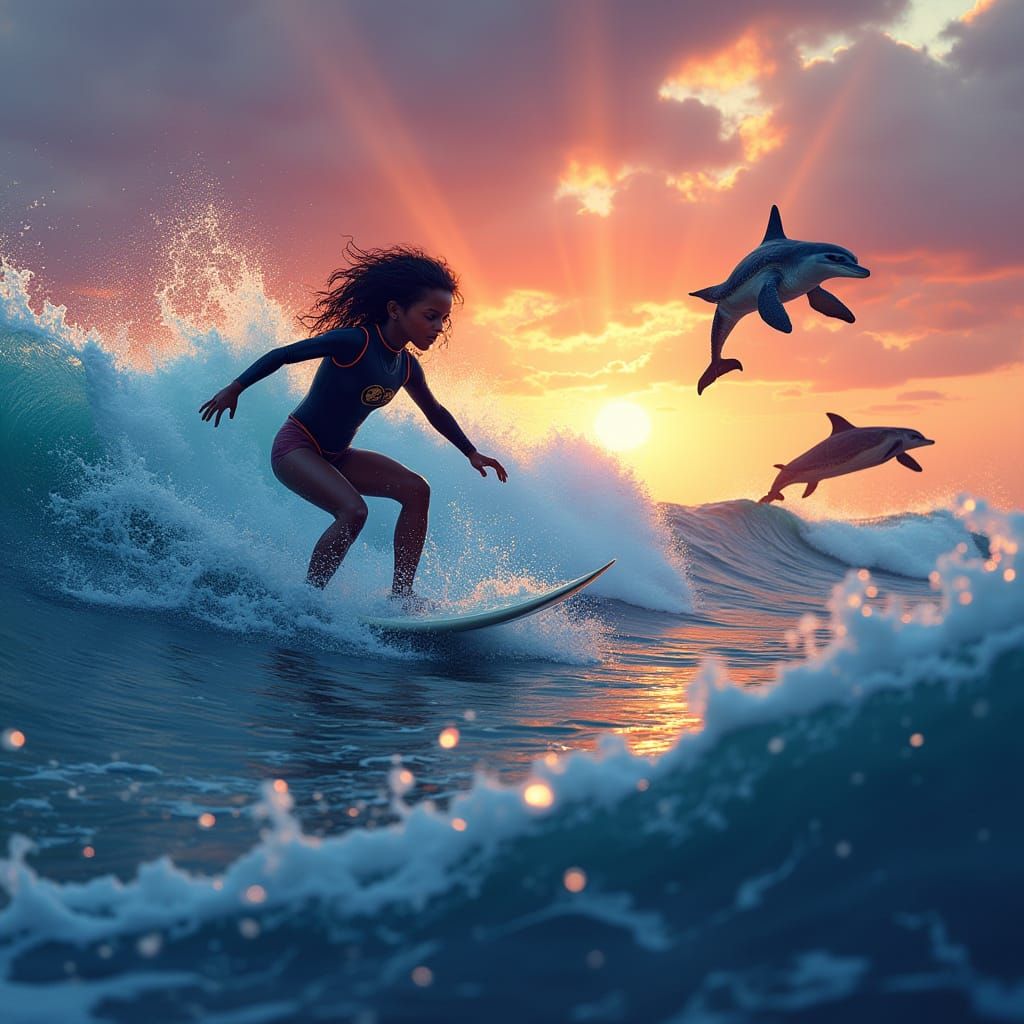 This image shows a dark-skinned girl surfing in a deep ocean, surrounded by aquatic life. The vibrant sunset colors and realistic wave dynamics create a stunning, surreal scene in a digital art style.