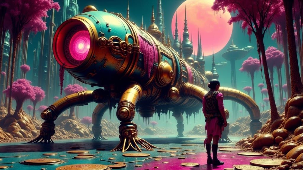 A striking picture of an intricate nanobot in a sci-fi setting. This digital artwork blends ink wash techniques with futuristic Rococo elements and vibrant, otherworldly colors in a hypermaximalist composition.