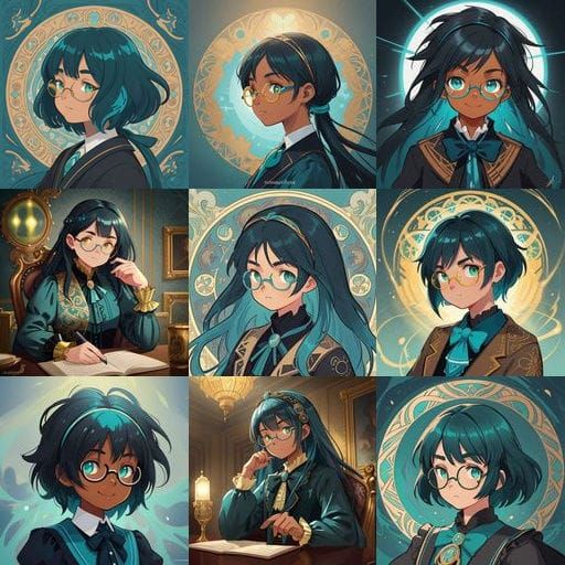 This image is a high-resolution, concept art portrait of a young African American woman wearing Victorian-style clothing and black glasses, set against a vibrant teal background. The artwork showcases intricate details and dynamic lighting, characteristic of a triadic color palette.