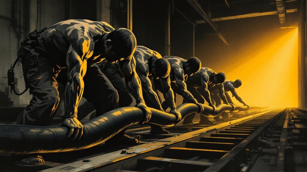 This image shows industrial workers in a coordinated effort. The powerful, graphic portrayal of labor in an industrial environment is depicted with bold textures, social realism and architectural clarity.