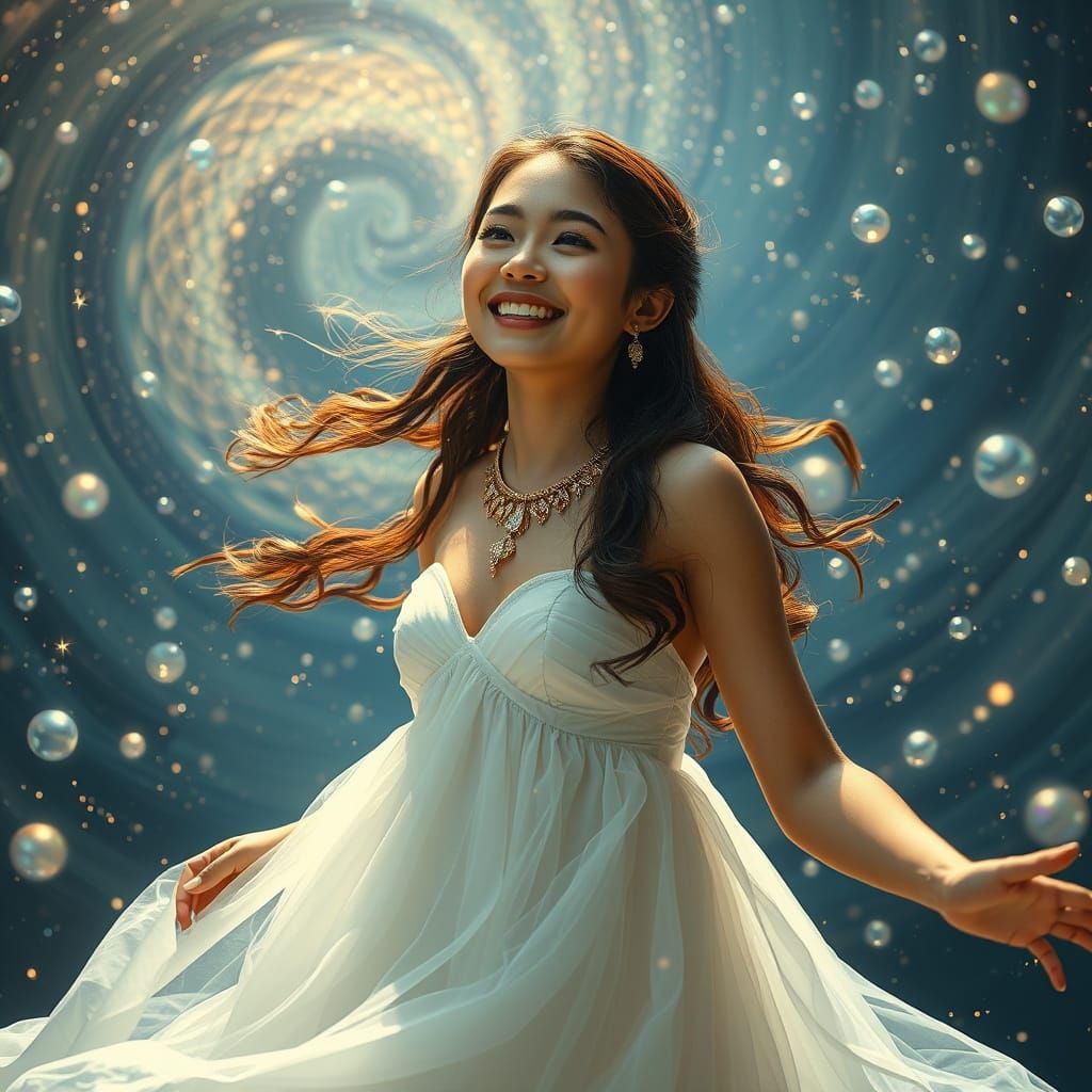 This image shows a serene young woman surrounded by a stunning galaxy of stars and iridescent bubbles, exuding joy and radiance, with delicate golden accents and diamonds, in a cinematic and dreamlike atmosphere, blending hyperrealism and atmospheric lighting
