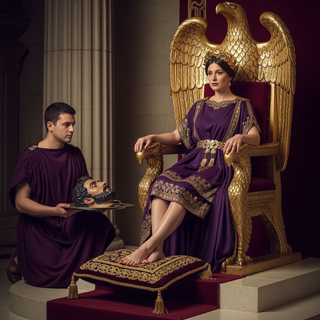 This image shows a Roman Empress on a golden eagle throne. She's in a throne room with a servant kneeling before her and holding a tray. The scene is captured with bokeh and natural lighting.