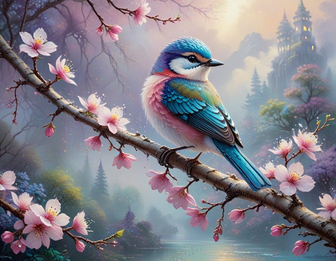 This image shows a detailed oil painting of a beautiful, colorful bird perched on a branch adorned with soft pink blossoms, set against a misty, ethereal landscape.