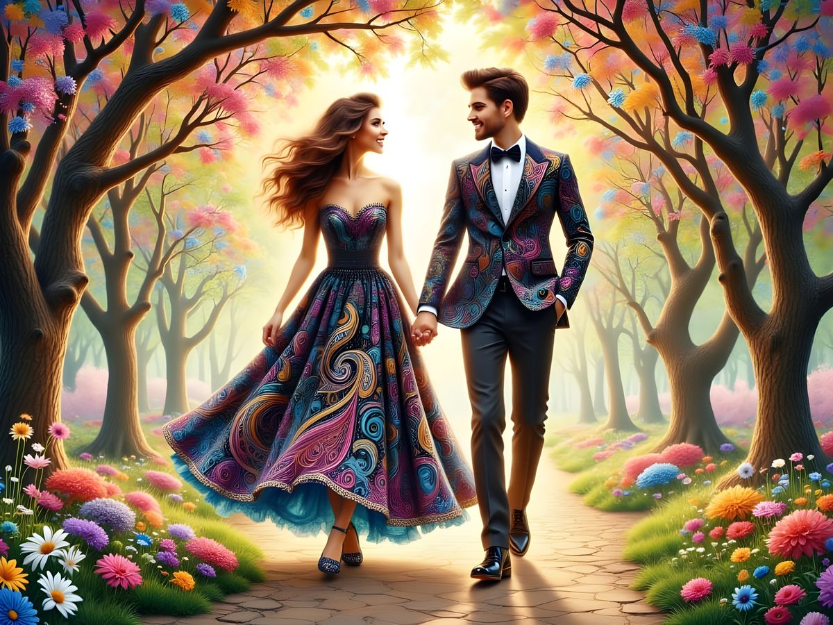A striking image of a couple dressed in matching paisley attire, walking through a park where even the trees and flowers feature intricate paisley designs.