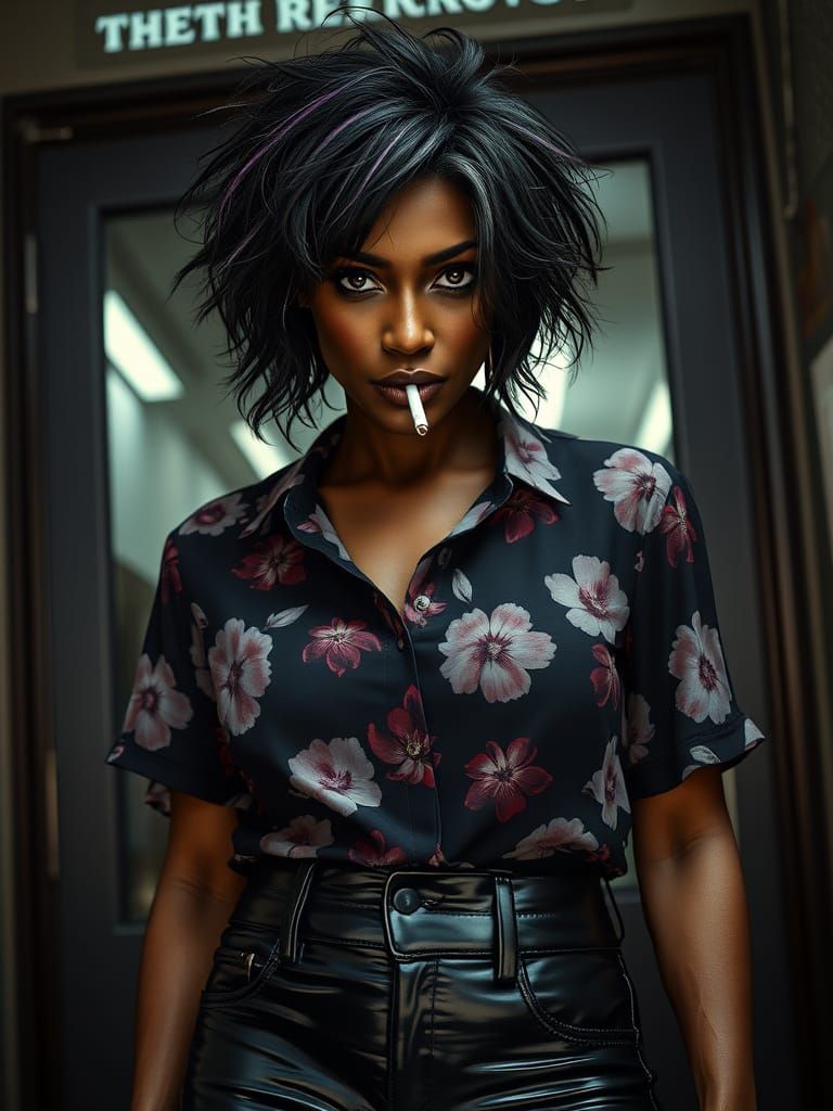 A striking picture of a mature Black woman standing outside a gritty office. She has deep brown eyes and messy black and grey hair, and holds a cigarette with an air of defiance, in a triadic-color art nouveau aesthetic.