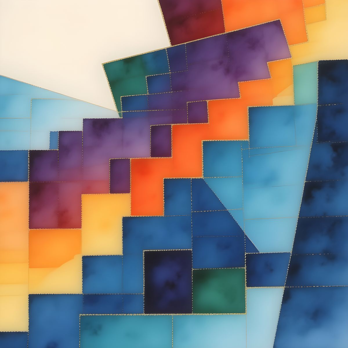 This AI-generated art features isometric trapezoids with lively gradient fills. The abstract geometric style uses a modern palette of blues, purples, and oranges.