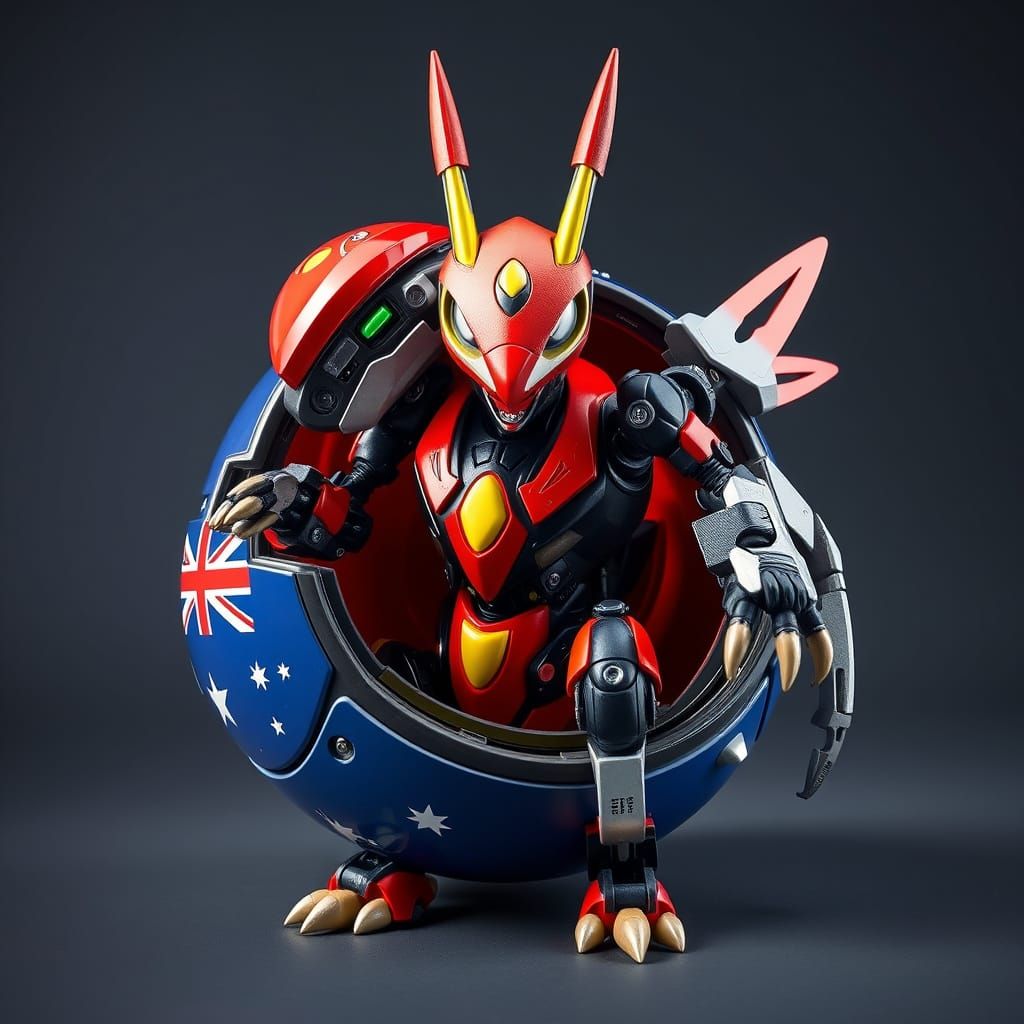 This image shows a futuristic Pokémon machine emerging from a vibrant Australian flag-coloured Poke Ball, surrounded by a unique gumnut marsupial Pokémon in a blend of industrial and futuristic styles, featuring intricate mechanical details and metallic textures.