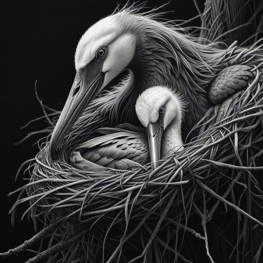 This image shows a close-up charcoal drawing of long brown hair intricately braided into a nest shape. A stork is welcomed in this high contrast, expressive artwork with delicate lines.