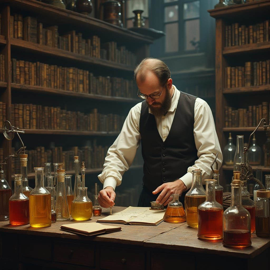 A detailed depiction of a Victorian chemist at work. The vintage laboratory is filled with bubbling beakers and aged texts, illuminated by warm lighting that creates intricate shadows in a retrofuturistic style.