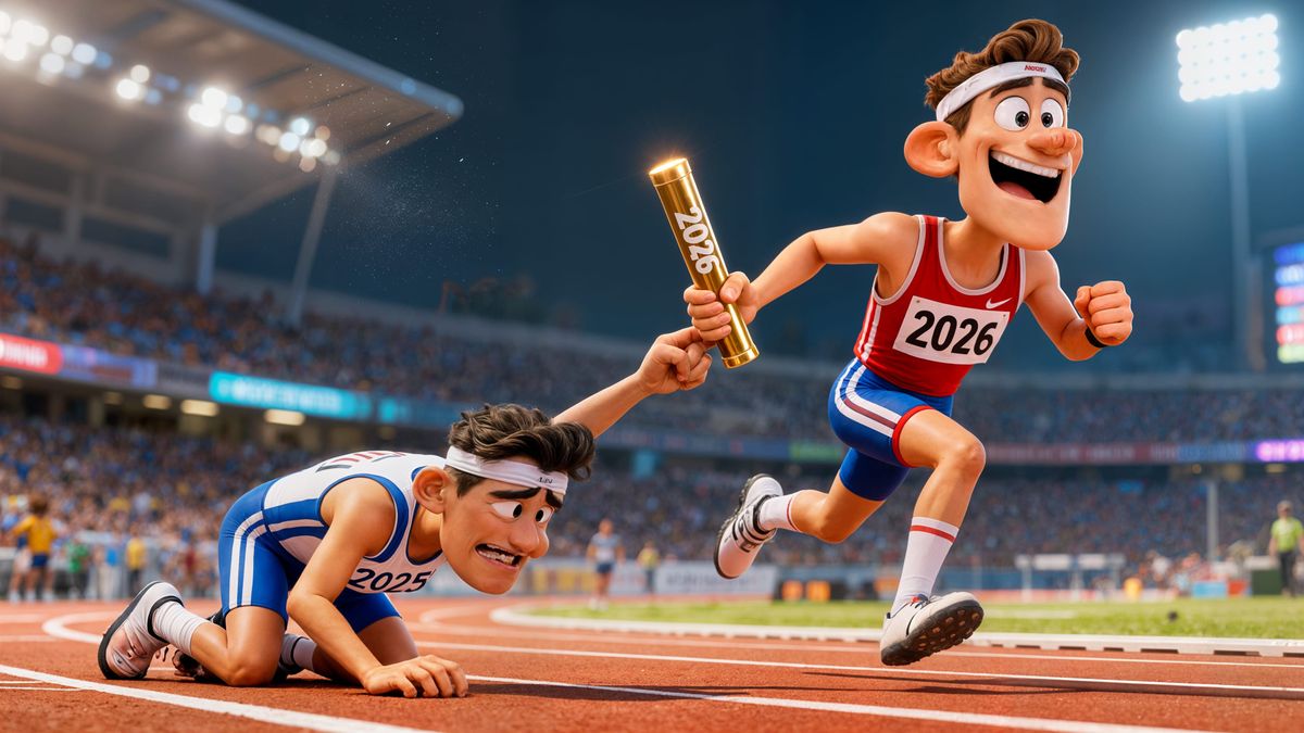 This image shows an exaggerated 3D cartoon caricature of an exhausted athlete handing a baton to an energetic successor, capturing a moment of whimsical handover.