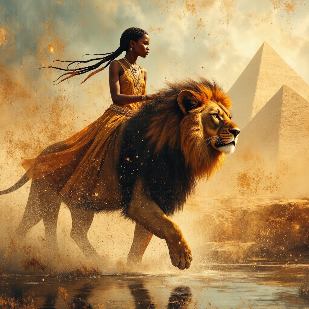 A hyperrealistic image of a young Egyptian princess riding a majestic lion by the Nile. Features dramatic lighting and divine oil painting textures, evoking a regal atmosphere.