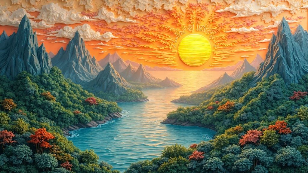 This stunning, hyper-detailed artwork features an intricately crafted ancient map, showcasing a breathtaking landscape with towering mountains, serene oceans, and lush forests, illuminated by a warm golden light, with crisp textures and realistic HDR effects, blending the styles of Amano, Ngai, and Hokus...