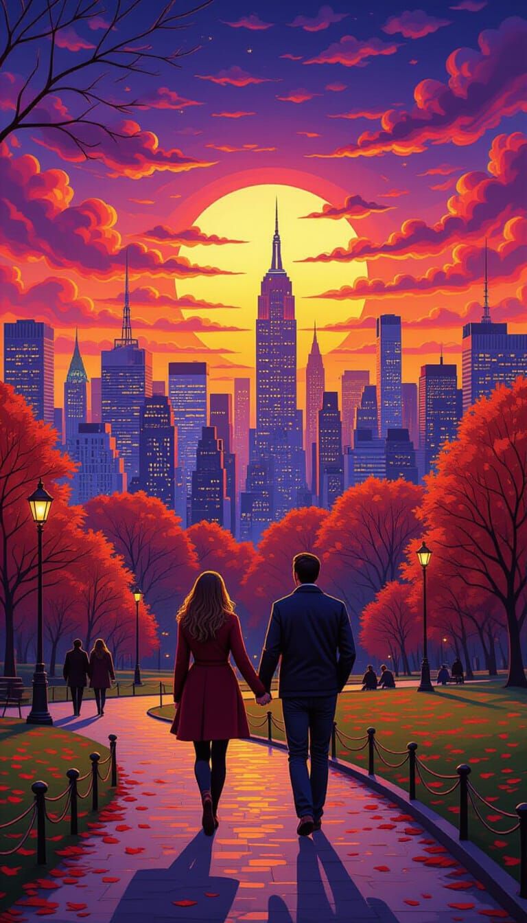 A vibrant acrylic painting of a couple walking hand-in-hand through Central Park at dusk. The scene is bathed in golden hour light, with a colorful skyline featuring the Empire State Building. The art has a surreal and romantic style.
