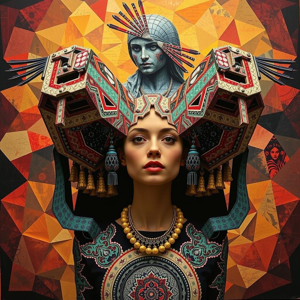 A captivating display of geometric patterns and vibrant colors. The image combines Art Deco elements with glitch and Op art techniques to create disorienting optical illusions.