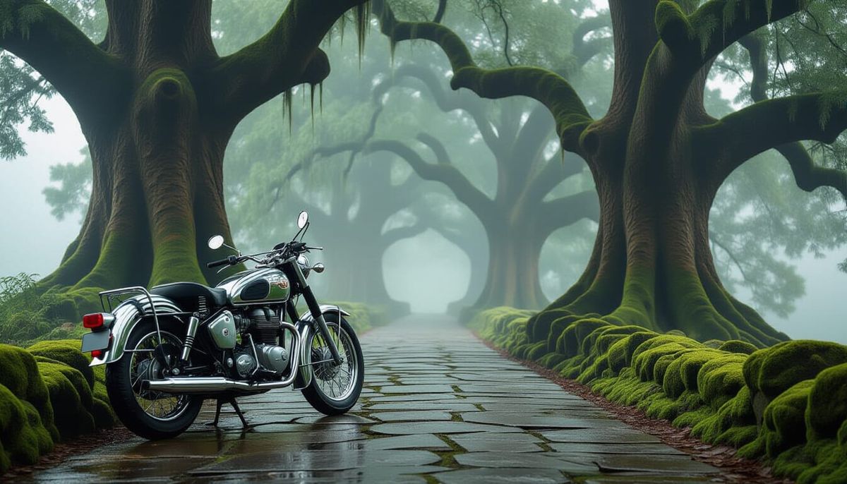 This image shows a vintage motorcycle on a mossy path, surrounded by ancient, fog-shrouded trees. Captured in a cinematic style with soft lighting and a desaturated palette, it evokes peace and isolation.