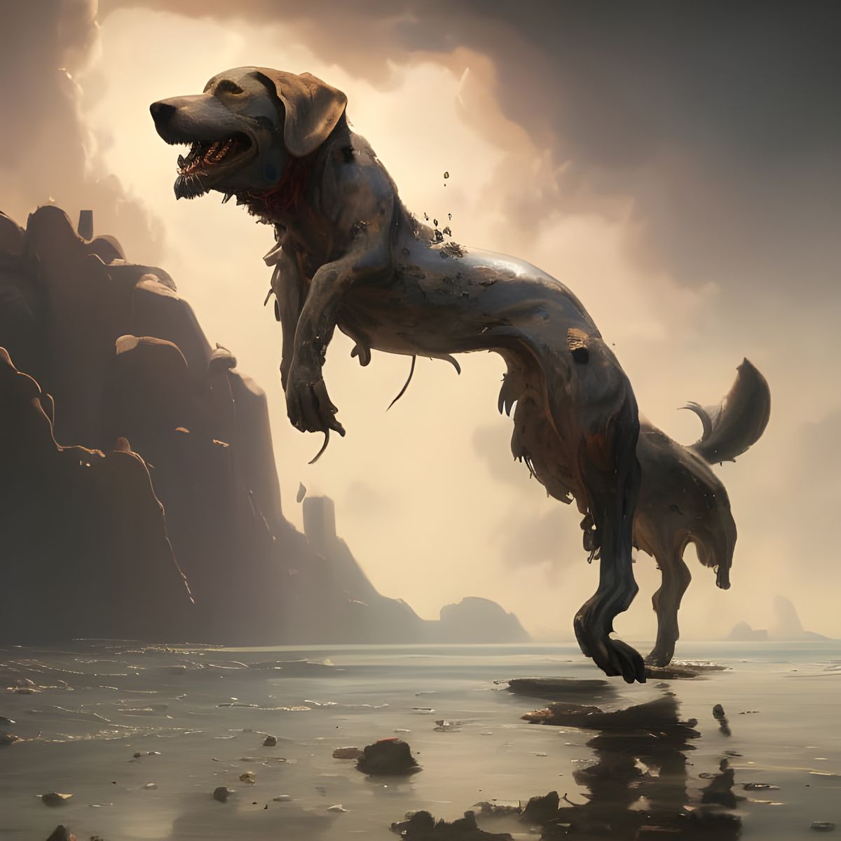 A surreal image of a melting dog in an abstract, psychedelic style. The artwork features dynamic lighting, intricate details, and triadic colors reminiscent of oil on canvas.