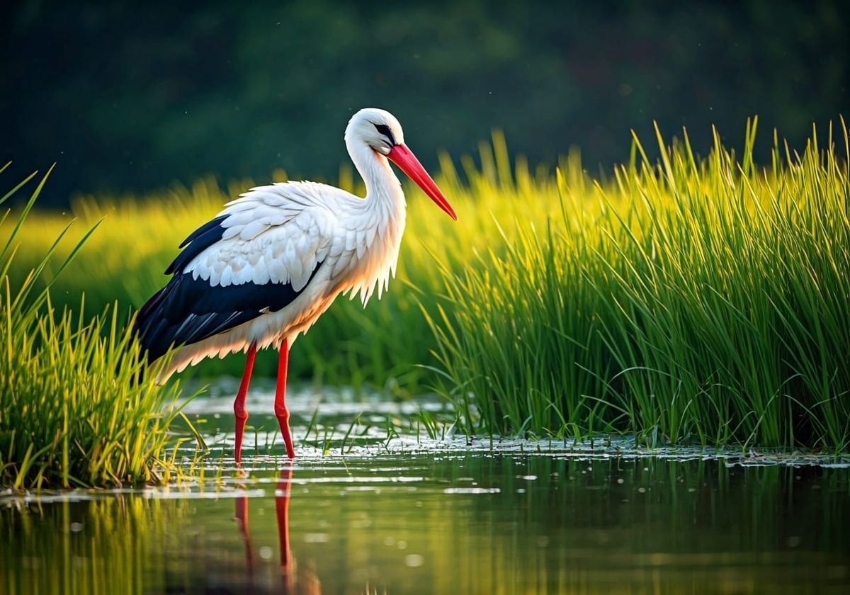 A watercolor painting of a white stork in a Polish meadow. The artwork features tall grasses, dynamic lighting and bokeh effects, rendered with a soft pastel aesthetic.
