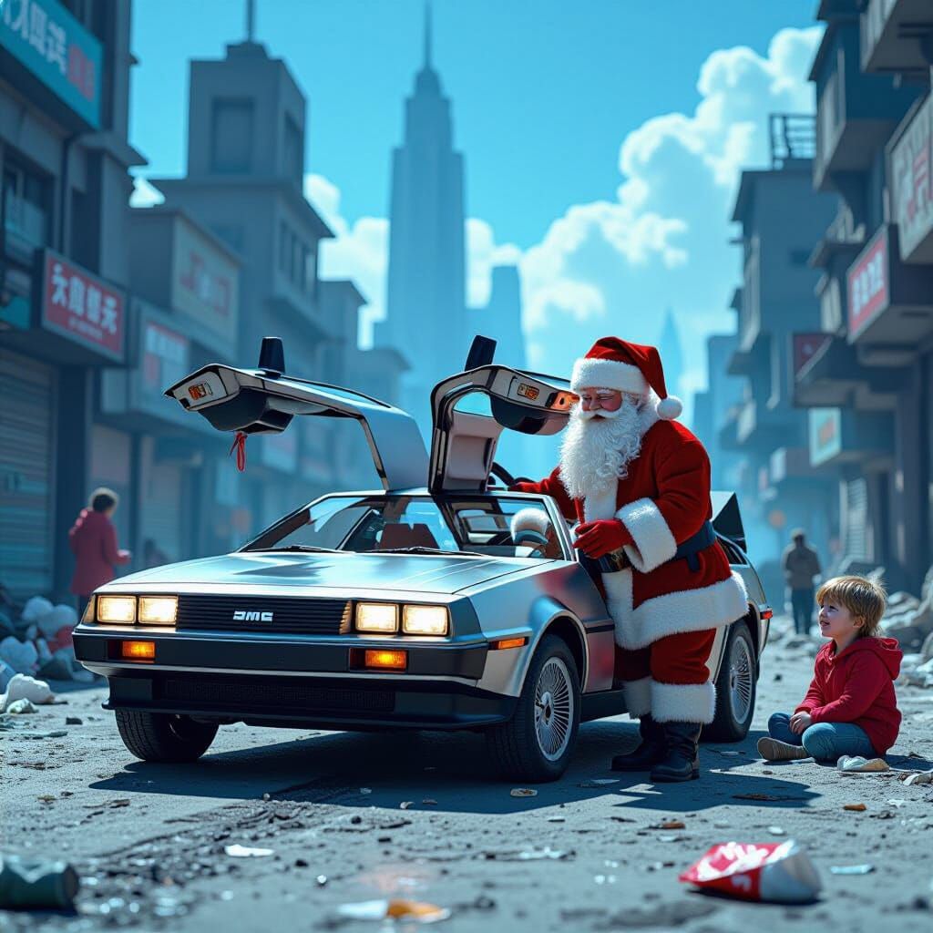 This image shows Santa Claus offering a gift to a child in a grim, futuristic city. The scene is depicted in a dramatic, cinematic style with moody lighting, inspired by classic sci-fi visuals.