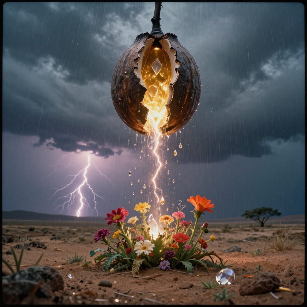 A hyper-detailed, cinematic image of a cracked seed pod in a stormy sky, releasing golden light that causes desert flora to bloom. Features dramatic lighting and film grain.