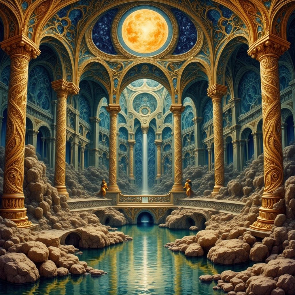 A digital rendering of Byzantine-style architecture featuring mosaics and gold. The image showcases mystical and ornate elements with inspiration drawn from illustrative and decorative art styles.