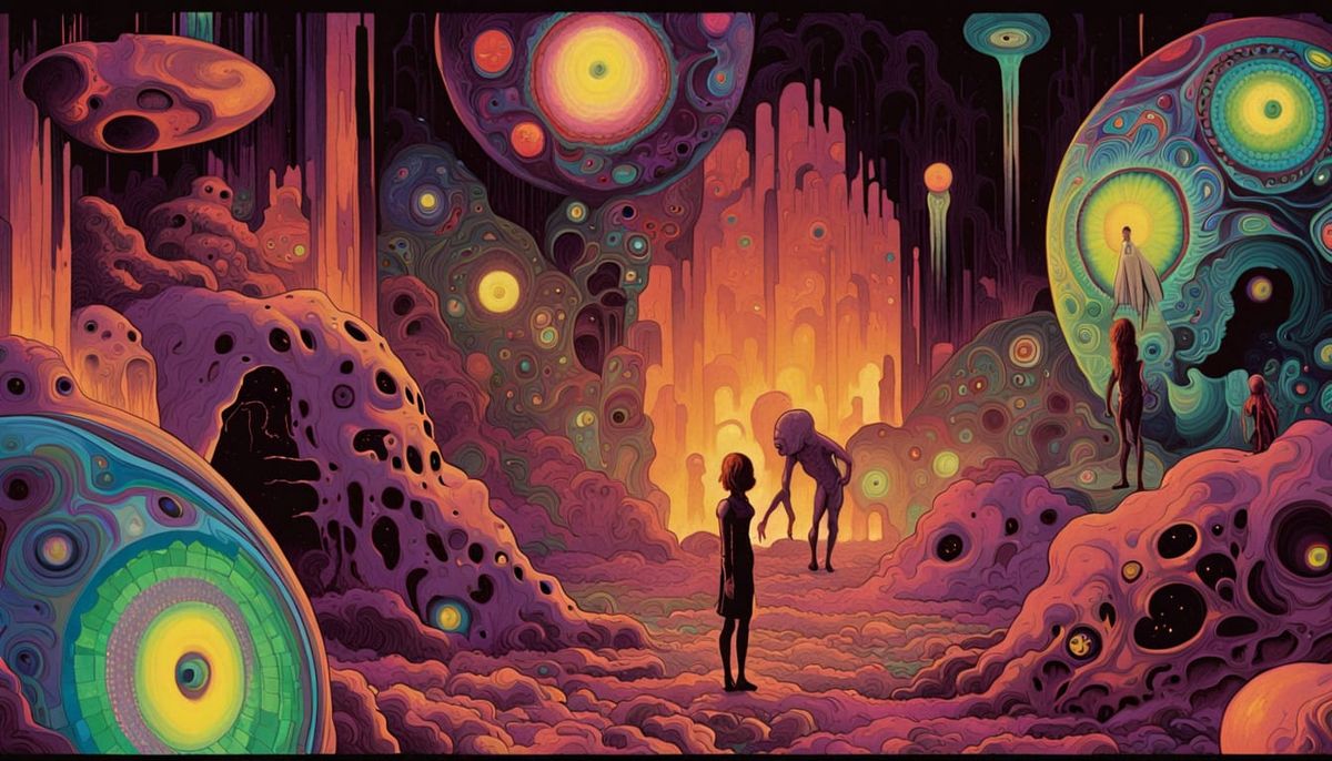This image shows two female aliens in a decaying 1973 home, rendered in a vibrant, psychedelic art style with ethereal light and cosmic horror elements.