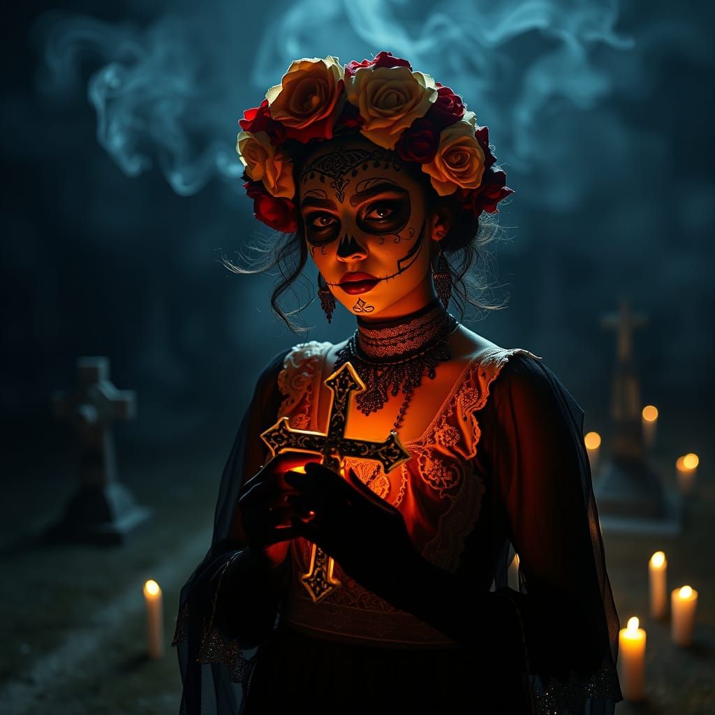 This image is a haunting portrait of a woman in intricate Catrina makeup, set against a dimly lit graveyard backdrop with a glowing crucifix and soft candlelight, evoking a sense of mystery and cinematic drama.