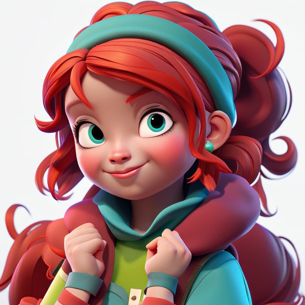 This image shows a cheerful, chubby, young redhead girl rendered as a 3D model. The artwork features a bright, colorful radial gradient background and cinematic post-processing, as 3D rendered digital art.