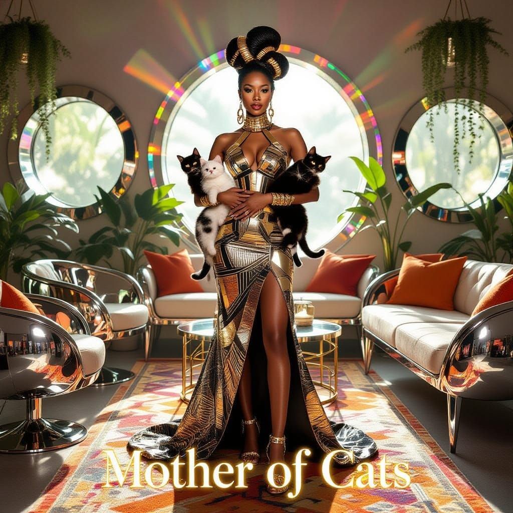 A striking picture of a Black woman in an Afrofuturist living room holding cats. She wears a metallic dress with geometric accents. Fiber-optic threads illuminate the scene in an afro-surreal aesthetic.