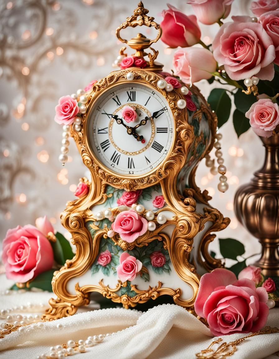 A hyperrealistic photo of a porcelain rococo clock adorned with roses and pearls. The clock rests on a silk towel, set in a luxurious room with flowers and soft bokeh.