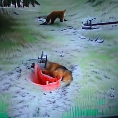 This image depicts a fox caught in a bear trap. The animal is gnawing at its injured paw, which is covered in blood. The scene is graphic and disturbing.