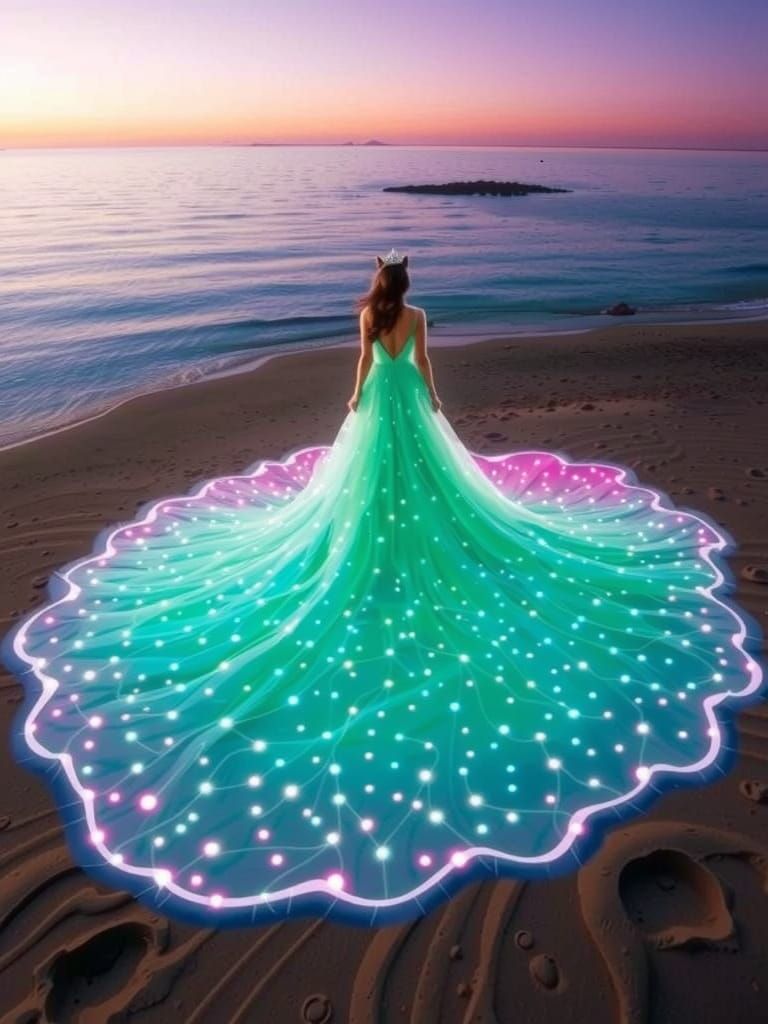 This image shows a beautiful, whiskered feline princess in a stunning, floor-length evening gown with a flowing train and sparkly tiara, embodying the elegance of Art Nouveau and whimsical fantasy