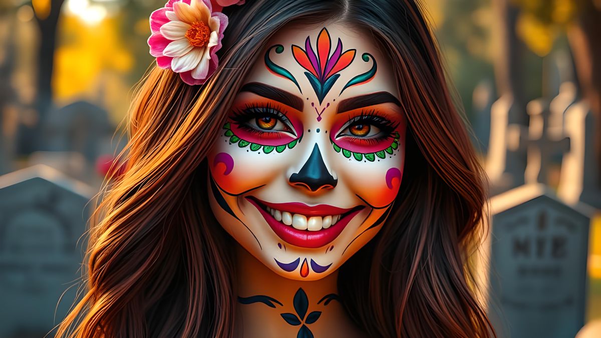 A digital art portrait of a smiling Latina woman with traditional Day of the Dead face paint. The cutepunk aesthetic features lively colors and a futuristic cemetery background.
