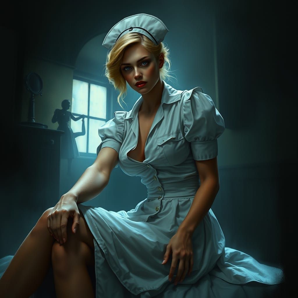 This image depicts a blonde German nurse with a subtle air of seduction, surrounded by an ominous atmosphere reminiscent of haunting illustrations. Characterized by dark, cinematic flair and meticulous detail, the scene evokes a sense of foreboding and unease.