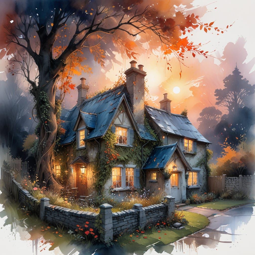 This enchanting image depicts a serene cottage with a dark blue slate roof, surrounded by vibrant autumn leaves and delicate flowers, bathed in the warm glow of twilight. A fusion of watercolour techniques and cinematic stylization creates a captivating scene of tranquility and mystique.