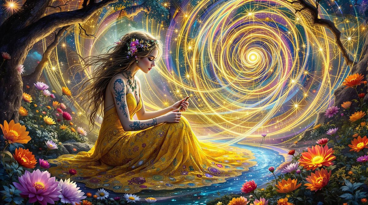 A striking picture of a gypsy woman in a swirling garden, playing a mystical instrument. The scene is awash with kaleidoscopic colors and fractal patterns, rendered with 3D shading in a visionary style.