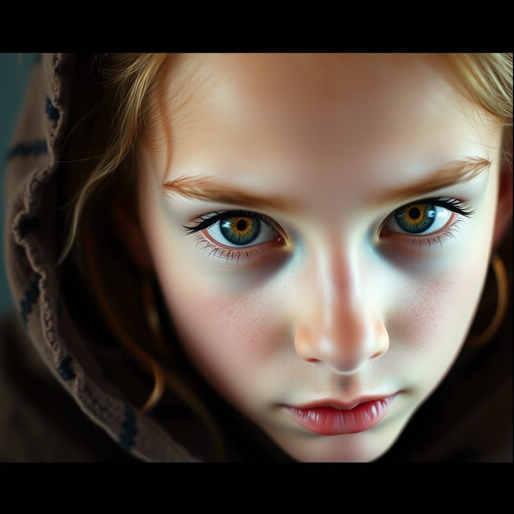 This cinematic film still captures a girl with striking earth-toned eyes, set against a richly atmospheric backdrop, reminiscent of 35mm film grain and cinematic lighting.