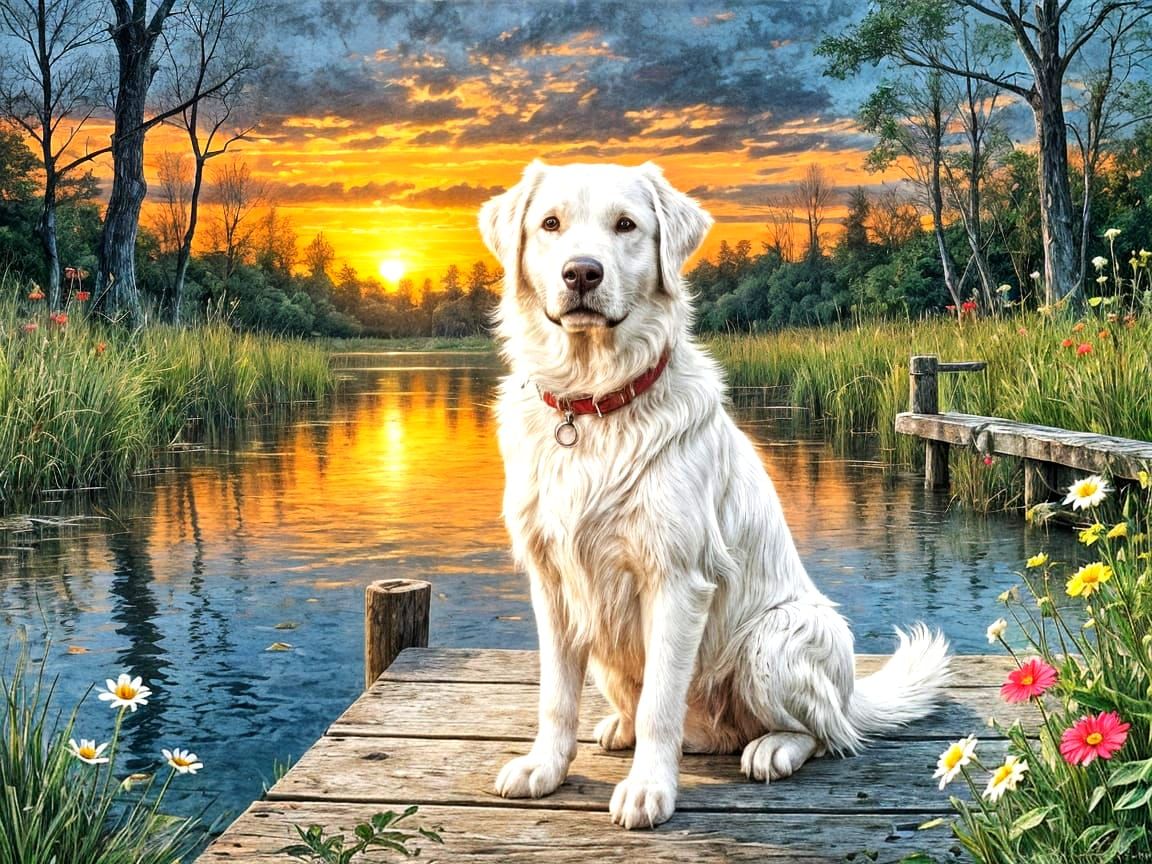 A white dog with large brown eyes sits on a dock by a swampy river during a vibrant, colorful sunset. This artwork features bold hues and a masterpiece aesthetic.