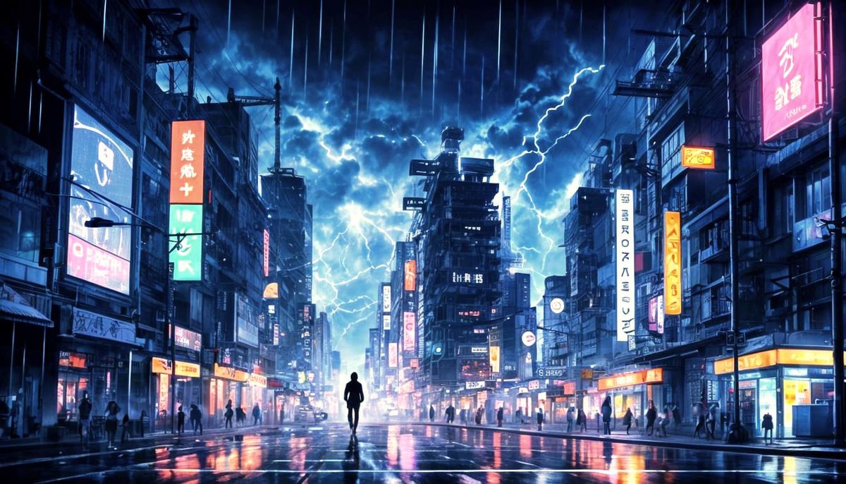 This AI-generated concept art depicts a rainy night in a vibrant, neon-lit cyberpunk city. Reflections shimmer on wet streets and buildings amidst a dramatic, stormy sky with lightning.