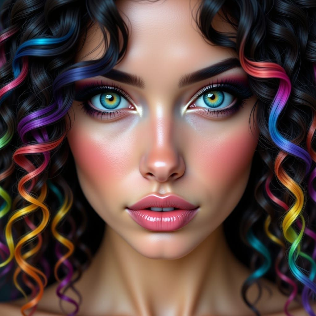 A hyper-realistic 3D portrait of a woman with vibrant rainbow hair and eyes, featuring glossy lips and detailed lashes against a dark background. The image evokes a futuristic, high-fashion cinematic aesthetic with nuanced lighting.